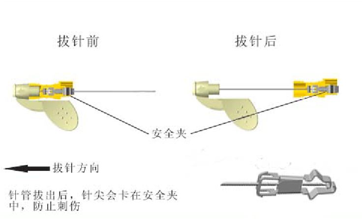 2. 拔出針尖收納于安全夾內(nèi),無法復(fù)原,表面無殘血,對醫(yī)護(hù)人員保護(hù)更安全。
